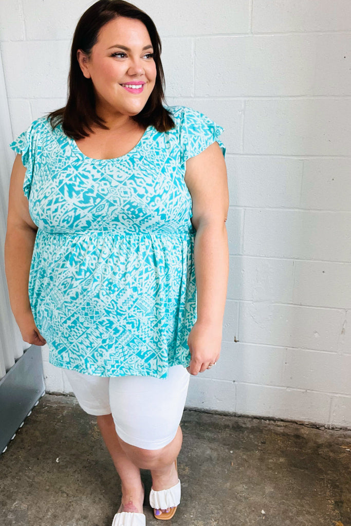 Aqua Boho Print Ruffle Short Sleeve Babydoll Top