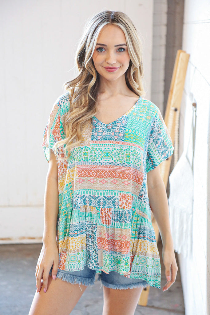 Add casual charm to your closet with this boho ethnic patchwork rayon challis blouse featuring a wide V neck for your fav accessories and a baby doll peplum design.