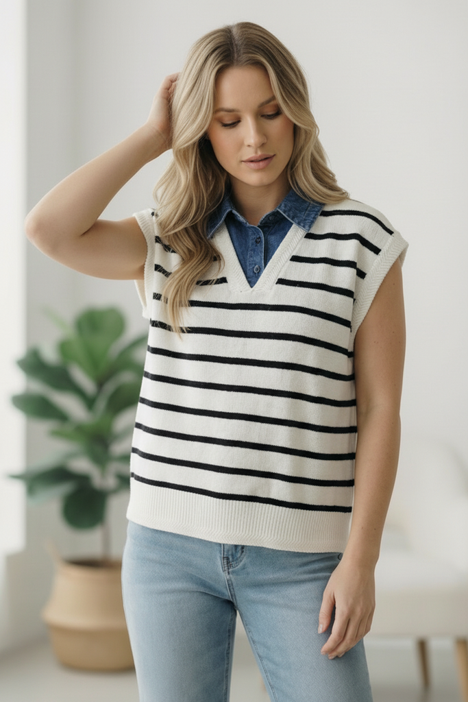 Effortlessly polished with a modern layered vibe, this denim collared vest gives the style of a perfectly styled outfit in one easy piece. Designed with classic stripe sweater knit detailing and a built in denim collar accent, it creates a chic contrast that feels both timeless and on trend. The relaxed dolman silhouette offers a comfortable drape, making it an easy go to for pairing with denim or casual bottoms for a clean, put together boutique look.