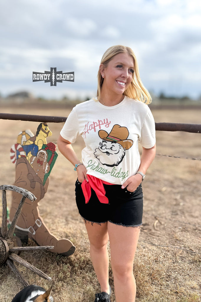 Santa’s gone western! The Yeehaw-lidays Tee brings festive cheer with a cowboy twist-featuring a jolly Santa in a hat and rope-style lettering. Soft, fun, and full of western holiday spirit, this tee is perfect for every cowgirl or cowboy celebrating Christmas, Rowdy Crowd style.
